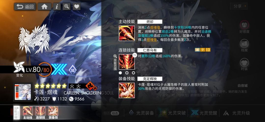 最后则是火卡莲的第二个灵魂技能--装备技能,它可以用简单粗暴来形容,忽视防御就是火卡莲身为转色却能打出主C伤害的缘由所在,这里的装备技能伤害吃克制加成、普攻吸收率、连击数和格子倍率,可以放在队尾来享受团队提供的加成,最大化自身输出效率。