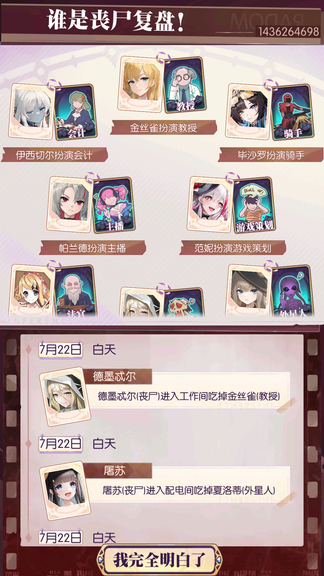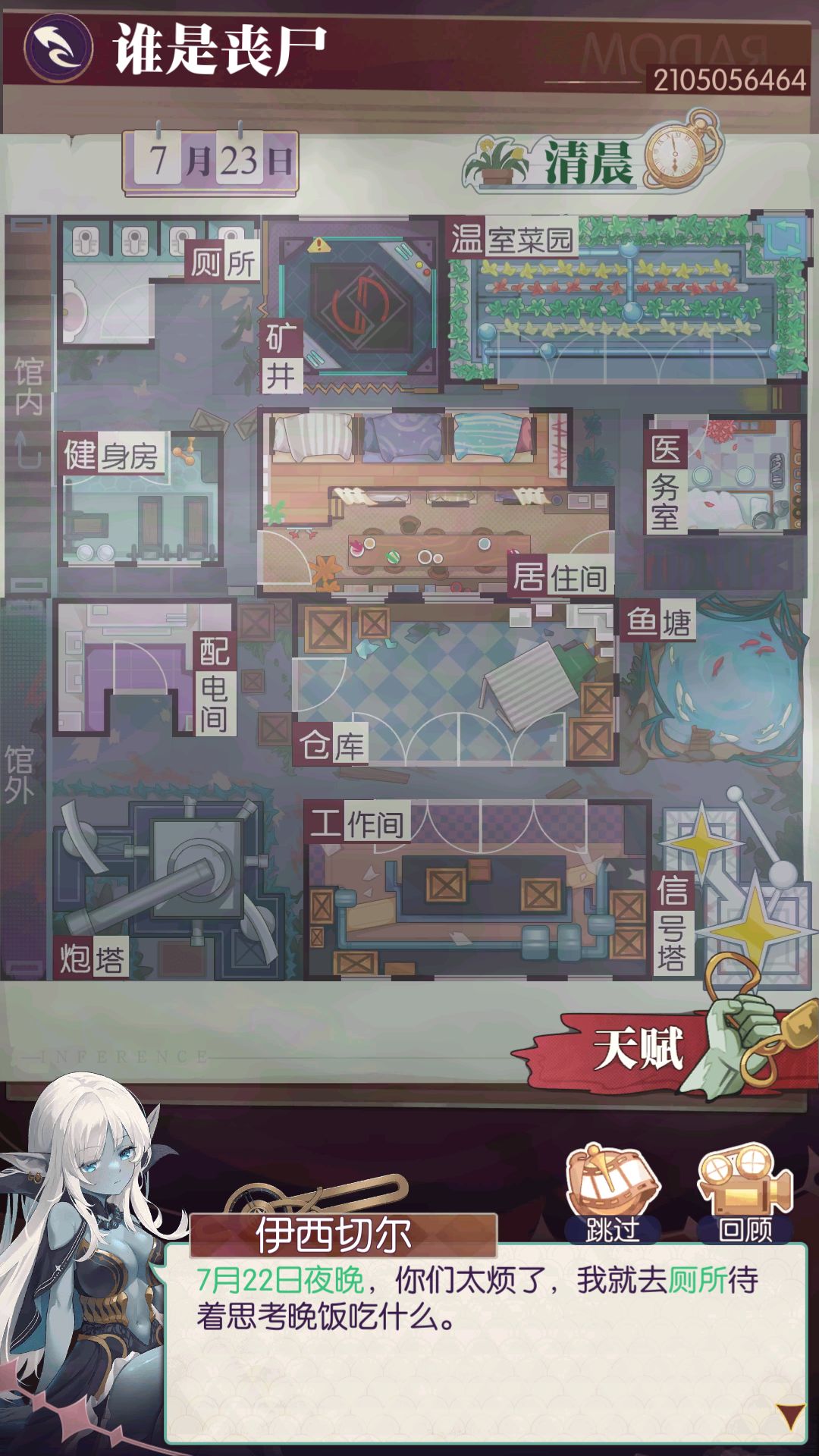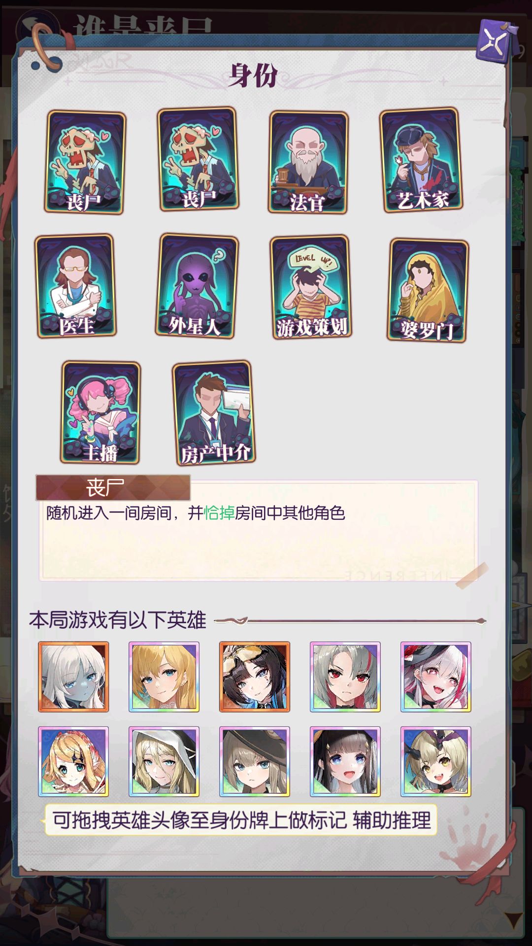 玩家白天或晚上进入房间获得线索,通过各个英雄的对话分析“丧尸”是谁,并指认“丧尸”。