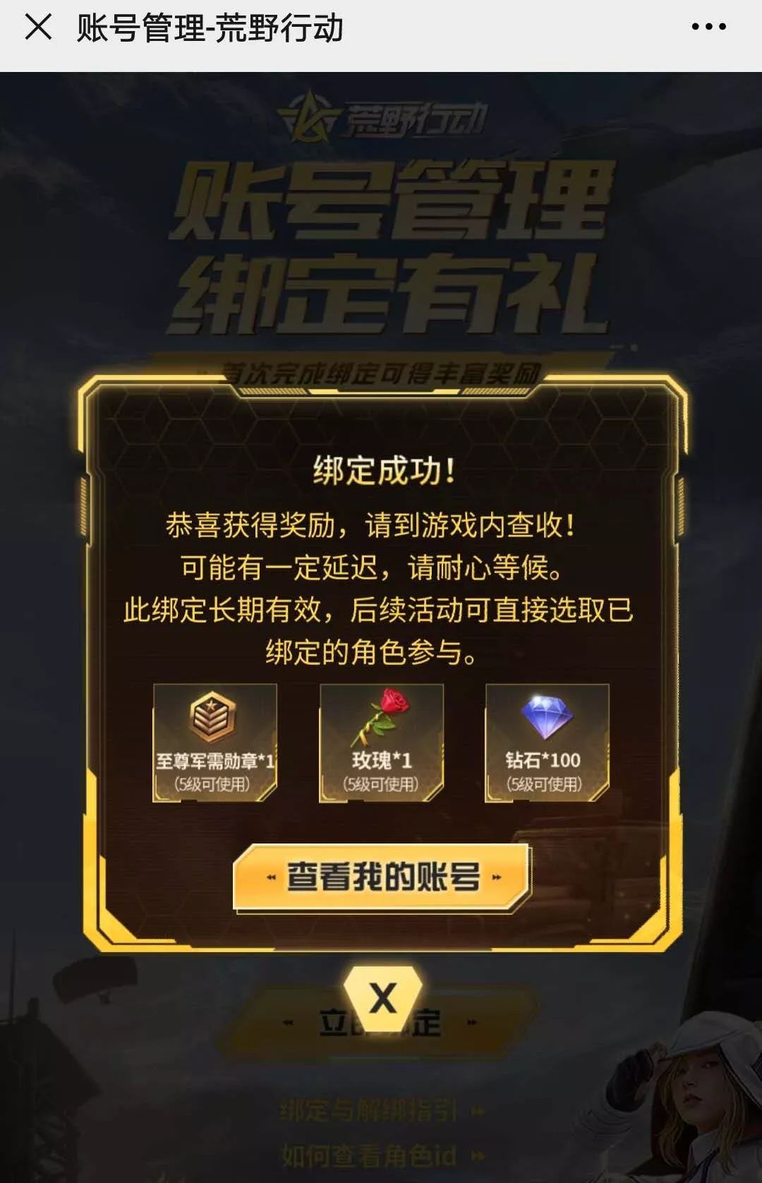 绑定成功后会出现此界面,同时至尊军需勋章、玫瑰和钻石也收入囊中!快到游戏里查收奖励吧!