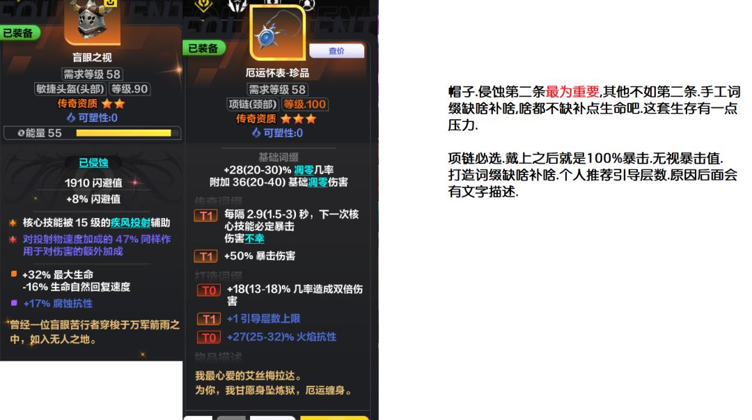 这套流派的玩法思路是:环绕飞刃投射物数量会增加范围,两把武器寒枝扭结会使范围增加投射物速度,帽子盲眼之视的投射物速度会增加伤害。这是核心增伤手段,而基础伤害来源则是蝉锐衣服,护盾提供高额元素点伤。