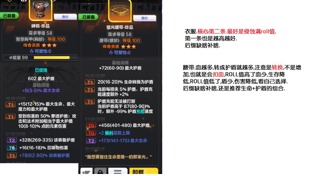 基础伤害来源有附加伤害与技能本身伤害,蝉锐的第二条属性,护盾值转化为点伤,是伤害的主要来源,12000护盾就有1200的三元素点伤,合计3600,且这是固定点伤,没有上下限,所以伤害不幸对我们没有影响,而环绕飞刃本身的物理点伤最高只有390(20级),如果提升技能等级,只有到了31级,才会加6%MORE伤,之前只增加点伤,所以蝉锐流派堆技能等级显然是不合适的.我们要做的就是堆生命与护盾就行.如果后期我们有足够拿基础伤的手段,可以换下蝉锐,这样我们的生存将会提高到一个夸张的地步.这也是我接下来研究的一个方向.
