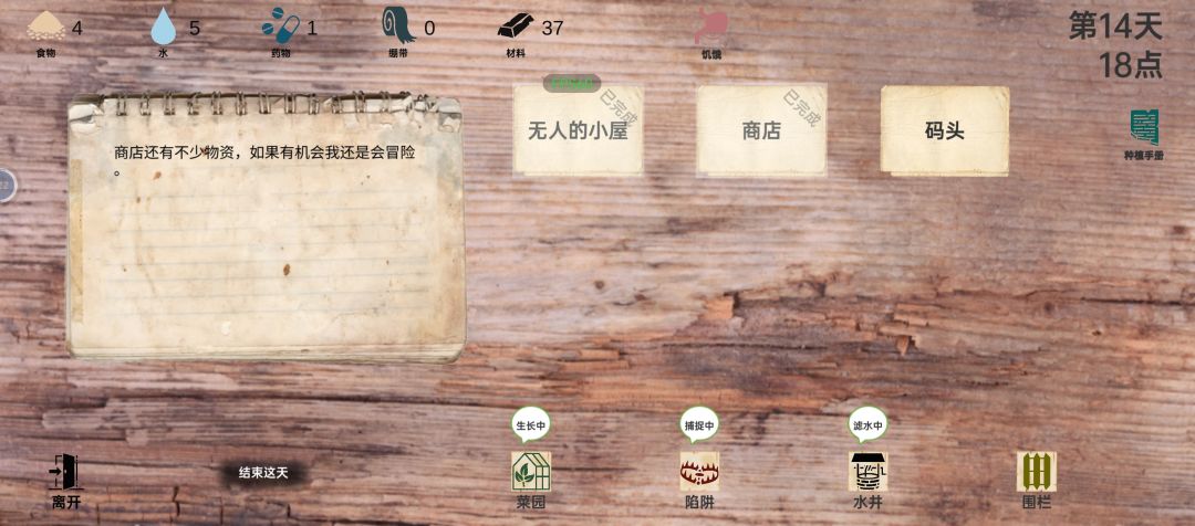 2.优点:材料多,一般情况下,前9天,水井、陷阱修好,第十三天修栅栏,运气好,第12天就能修农田。(直接自循环)