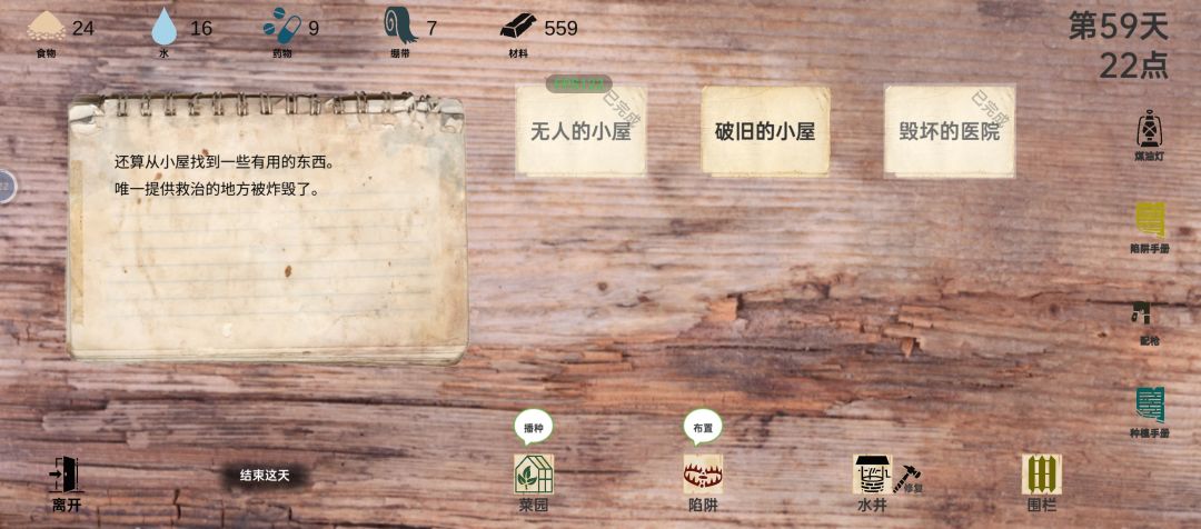 中后期:优先医院(保证手上有2-3个药和绷带,因为生病受伤频繁 ,无枪的话还可以探商店非必要不去医院治疗)