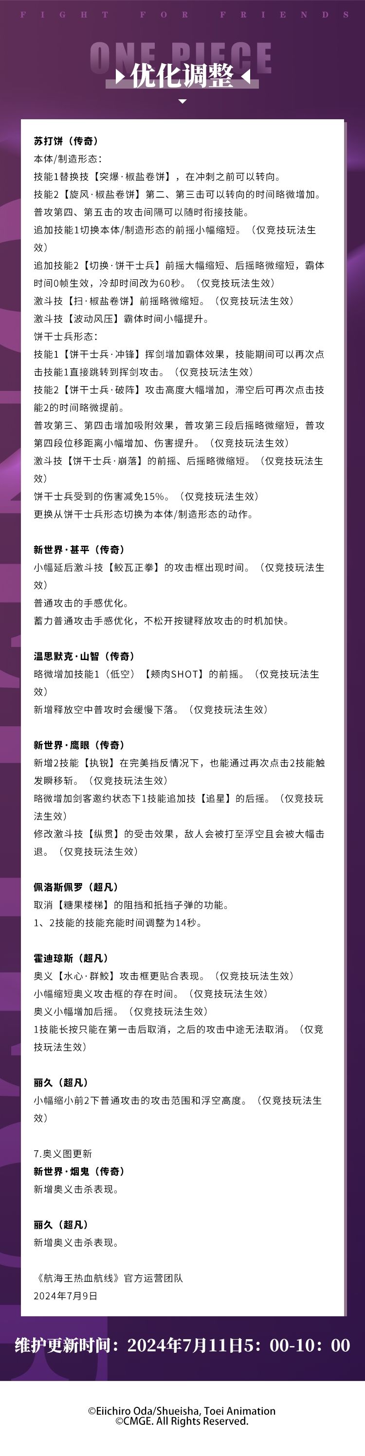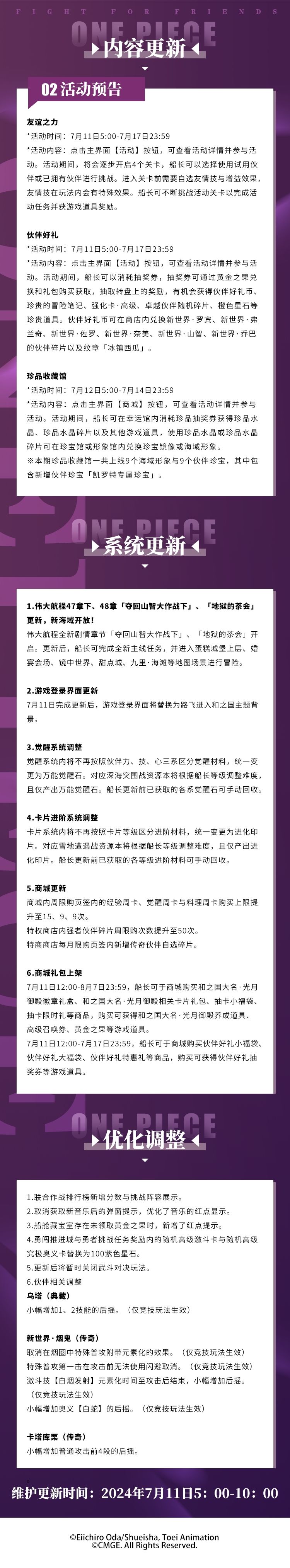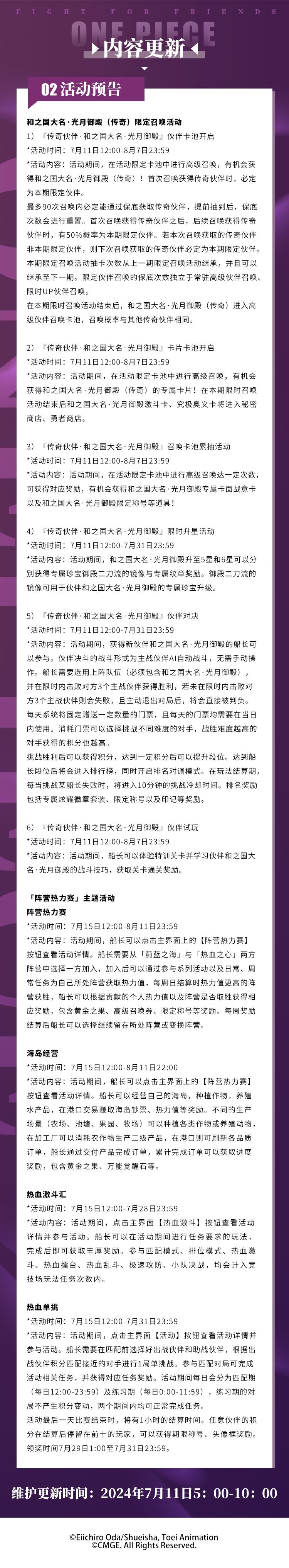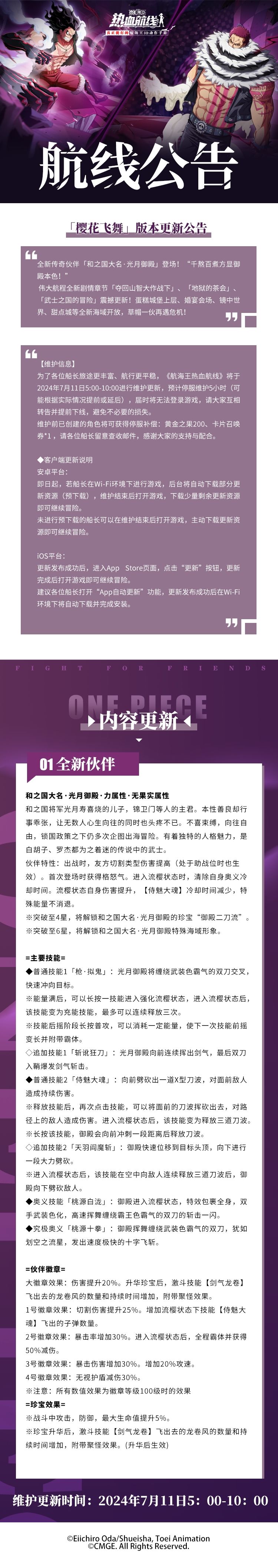 为了各位船长旅途更丰富、航行更平稳,《航海王热血航线》将于2024年7月11日5:00-10:00进行维护更新,预计停服维护5小时(可能根据实际情况提前或延后),届时将无法登录游戏,请大家互相转告并提前下线,避免不必要的损失。维护前已创建的角色将可获得停服补偿:黄金之果200、卡片召唤券*1 ,请各位船长留意查收邮件,感谢大家的支持与配合。