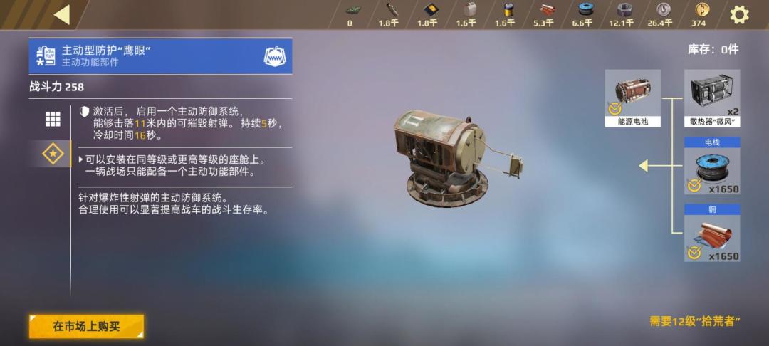 值得注意的是,在宙斯盾技术问世之前,玩家已经能够接触到多种主动防御模块,如下图所示的“鹰眼”。然而,“鹰眼”的功能相对局限,它仅能拦截并摧毁来袭的实体射弹,对于爆炸性伤害和能量射线等则无能为力,且同样不具备伤害提升的效果。这些差异体现了防御技术在不断发展与细化,以满足不同战场需求和战术策略。