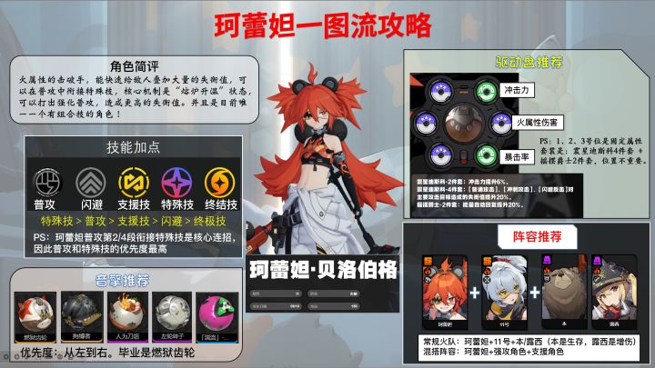 核心机制:强化特殊技、支援技、终结技都会给珂蕾妲添加一个“熔炉升温”的状态,在这个状态下,珂蕾妲普攻第2下会打出强化普攻,给敌人造成大量的失衡值。