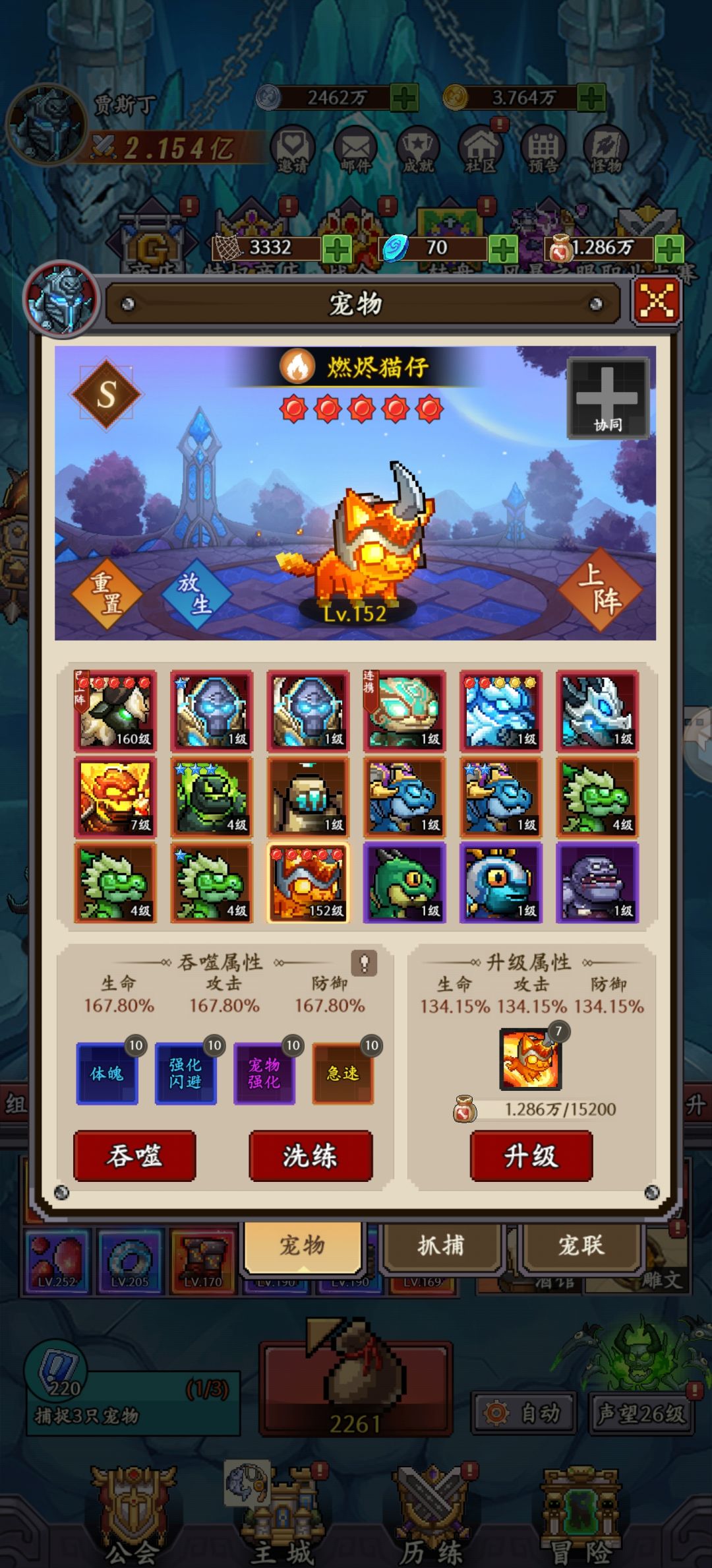 至于宠物技能选择,根据我的理解,这游戏目前宠物强化以及抵抗只有宠物有,而且收益巨大,所以我建议主宠最起码两个橙色宠物强化和抵抗,最好能搭上俩紫色强化和抵抗,当然这技能洗的代价非常高,各位量力而行