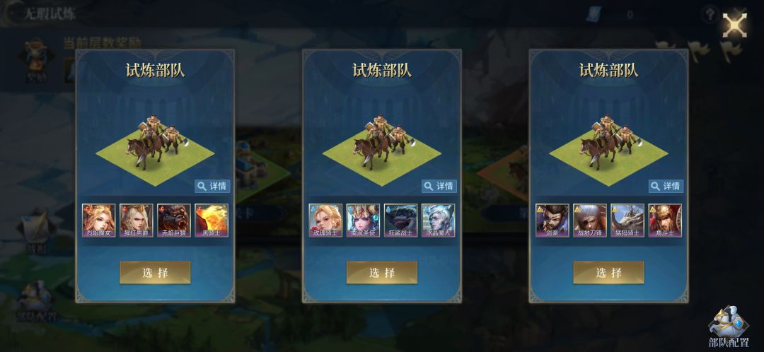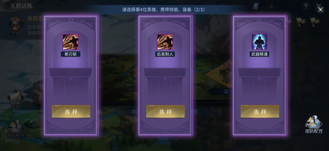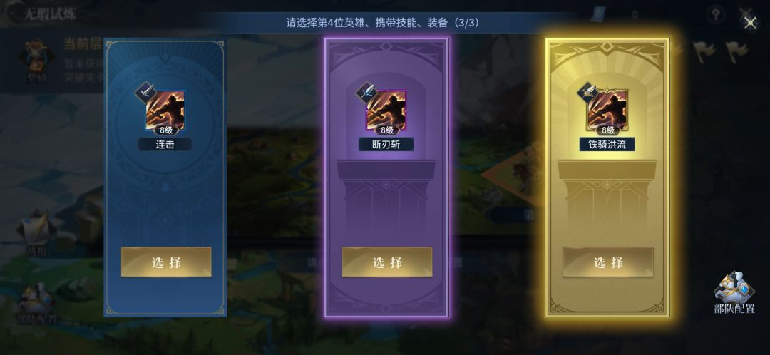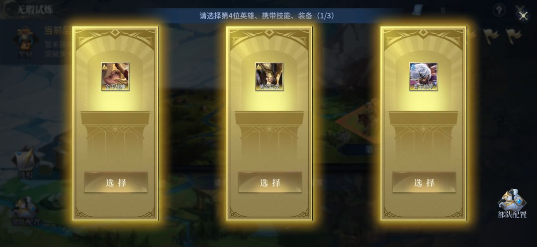 ②进入试炼后,需依次通过3选1方式抽取选择英雄、技能、装备来组建自己的试炼部队。
