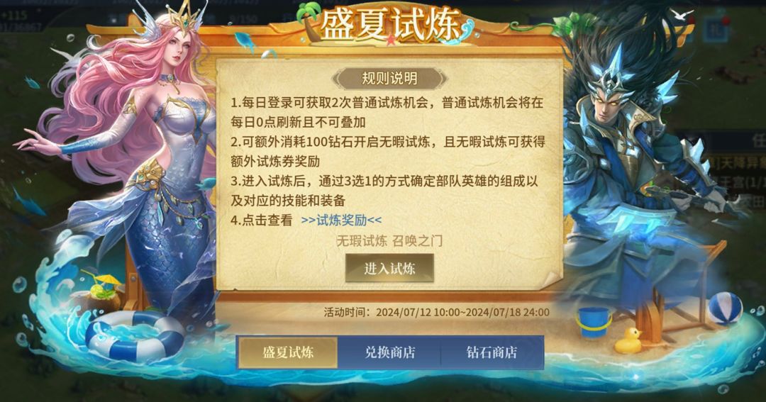 ①活动期间可消耗门票道具开启盛夏试炼玩法,每日登录游戏可获取普通试炼门票,钻石商店可购买无瑕试炼门票,使用无瑕试炼门票开启试炼玩法可获得额外奖励。