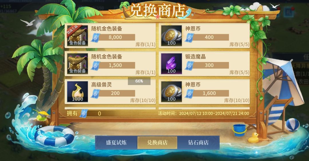 兑换商店活动期间,将限时开放兑换商店,可使用通过盛夏试炼玩法获取的试炼券兑换金色装备、神恩币等超值道具!
