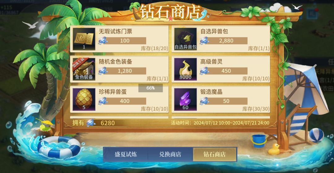 钻石商店活动期间,将限时开放钻石商店,可使用钻石兑换自选异兽包、金色装备等超值道具!