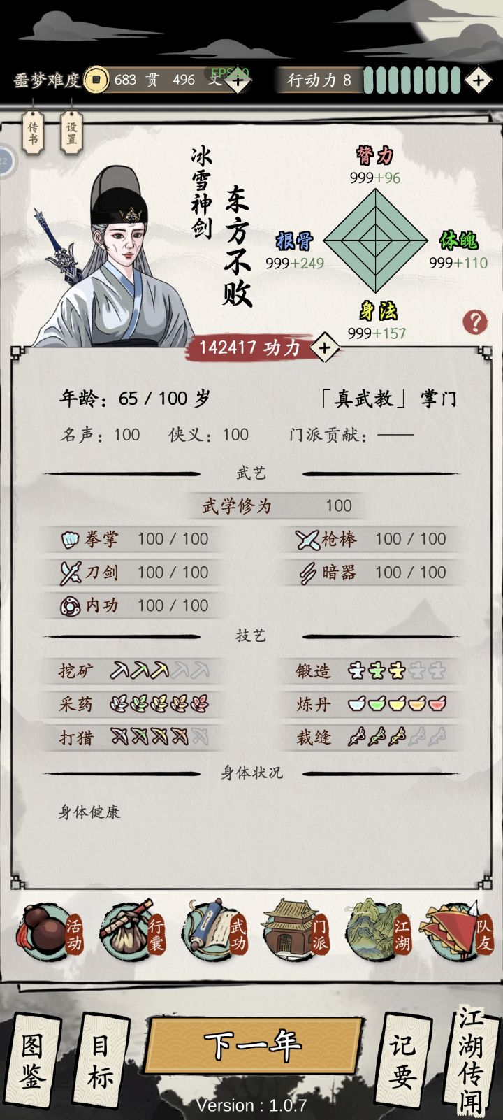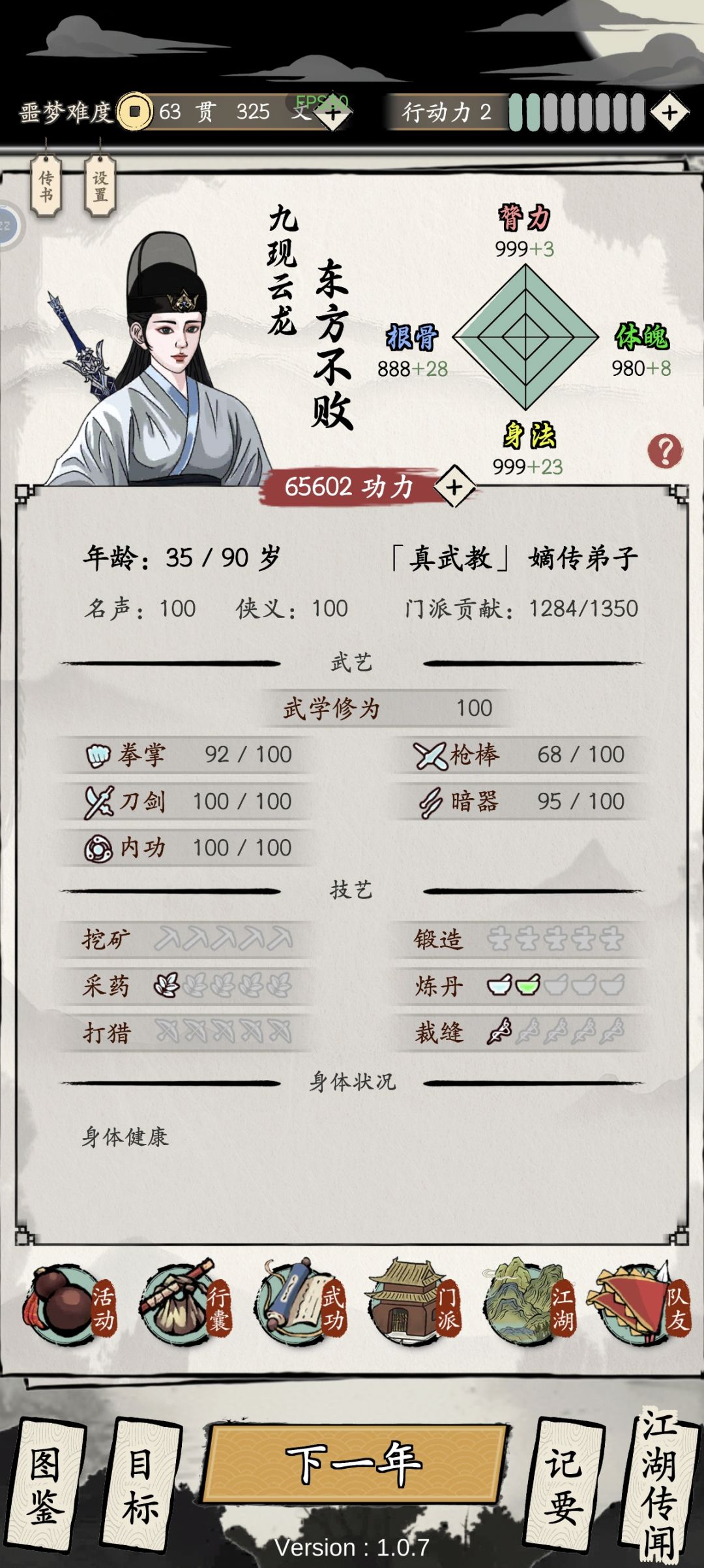 40岁之前成型,成型后伤害很高,噩梦模式七万战力可以打八万罗汉阵,后期无忧换自创剑法,最终13连锁攻击防御聚气回血这四个做到了极致,噩梦模式基本不会出现血量在一般以下的情况。自创功法可以选择致命,武器铭刻灵动致命阴柔,功效达到最大(铭刻根骨更加攻击力)