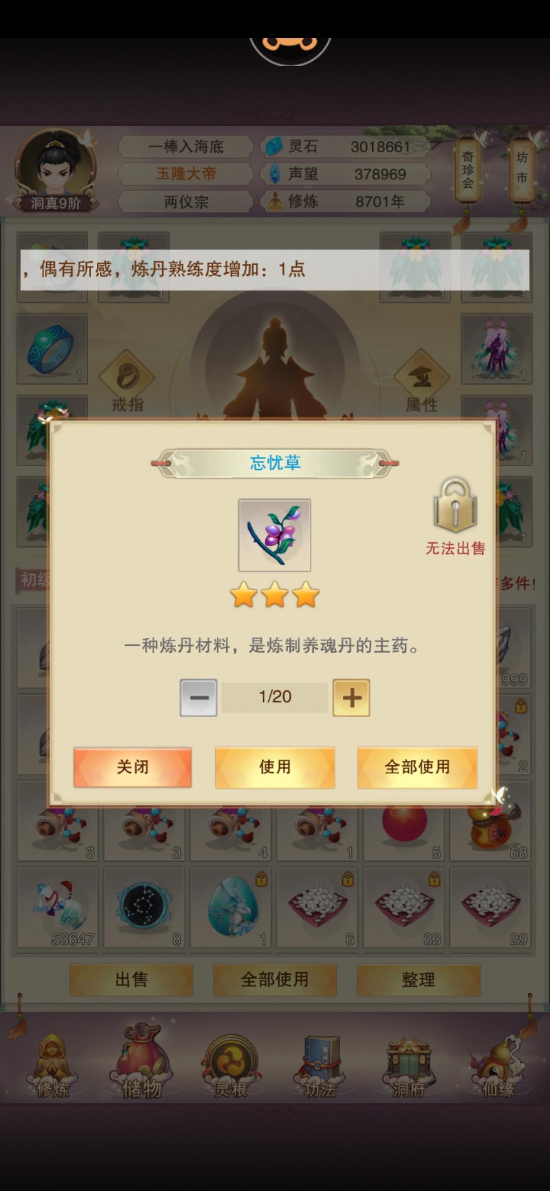 总结:据说后期忘忧酒红酒无处可用,而且洞府需要草铁过多,于是有了这个想法,算做草铁的另一来源。
