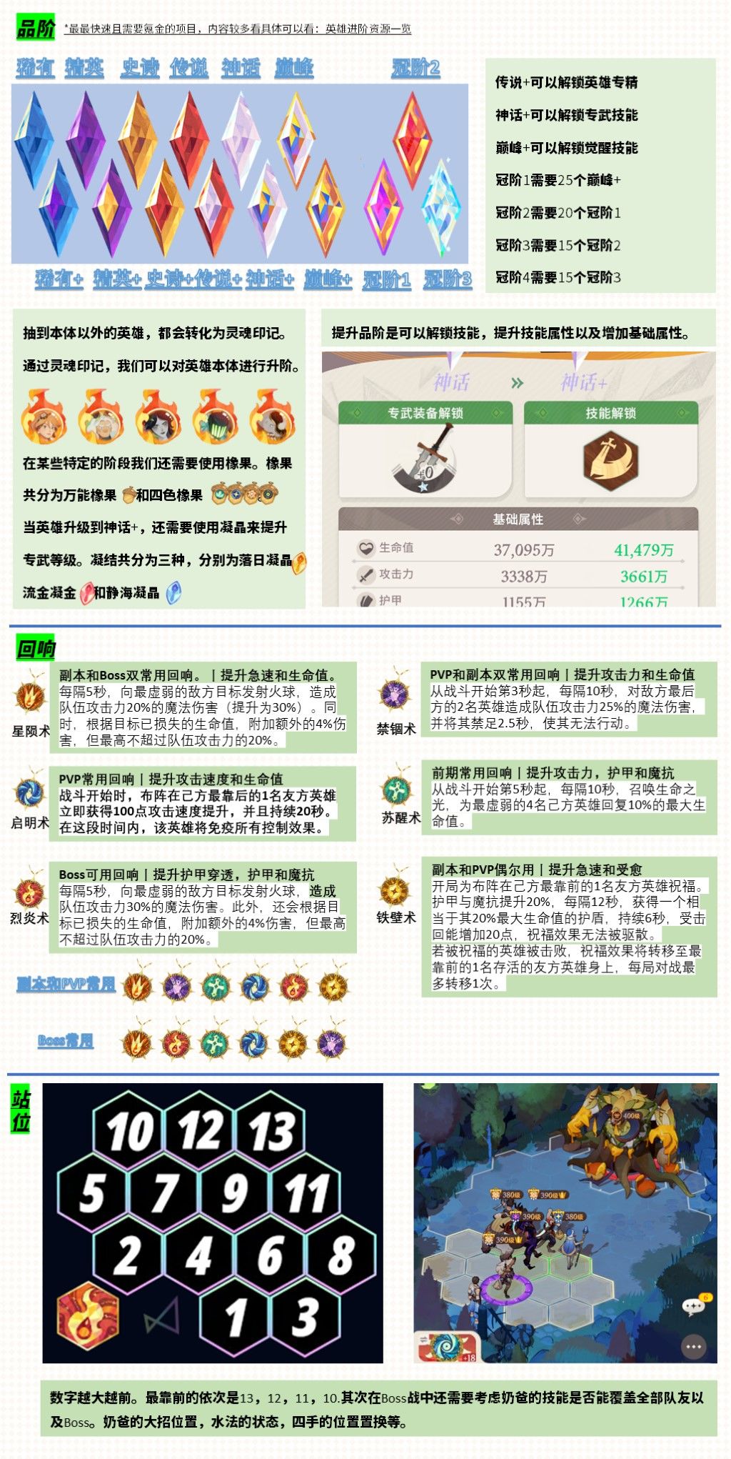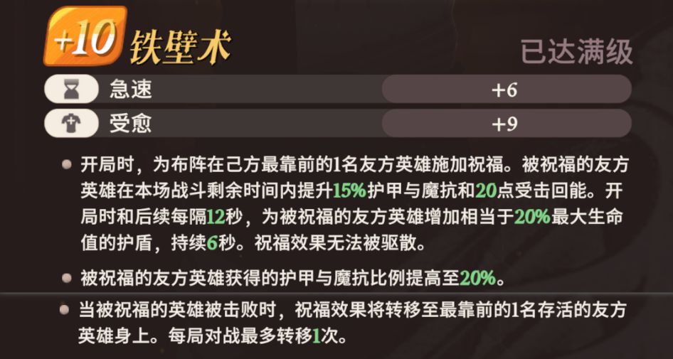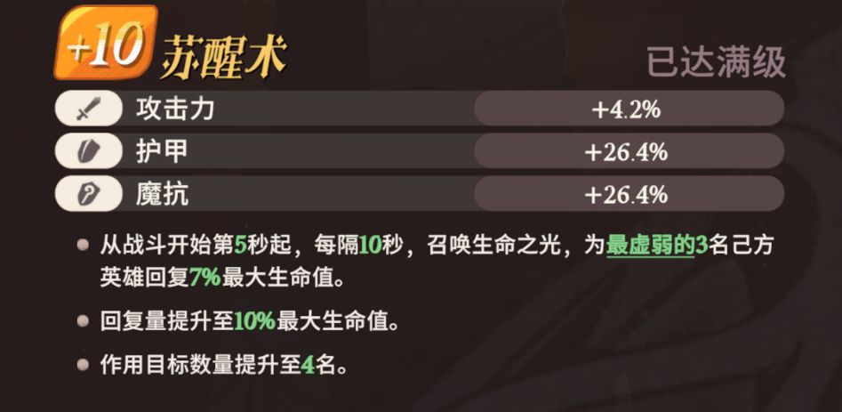在属性上主要提升,攻击力,护甲和魔抗。从战斗开始第5秒起,每隔10秒,召唤生命之光,为最虚弱的4名己方英雄回复10%最大生命值。