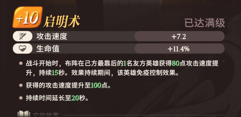战斗开始时,布阵在已方最靠后的1名友方英雄获得100点攻击速度提升,持续20秒。效果持续期间,该英雄免疫控制效果。