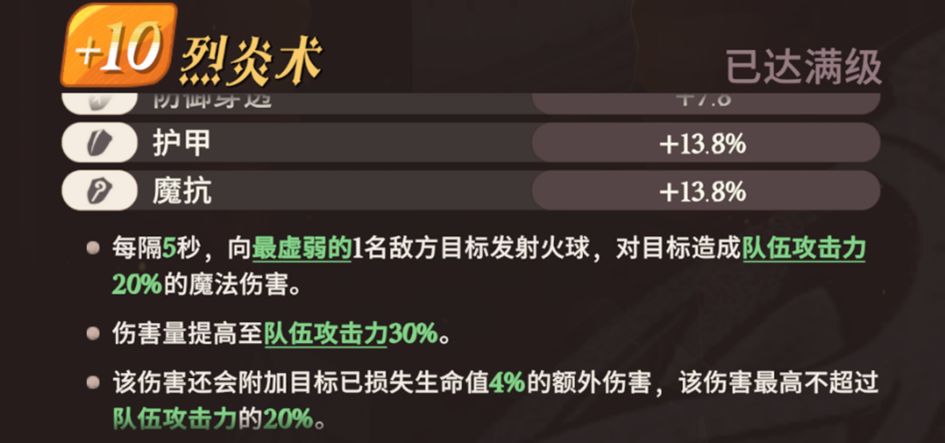 每隔5秒,向最虚弱的1名敌方目标发射火球,对目标造成队伍攻击力30%的魔法伤害。伤害量提高至队伍攻击力20%。