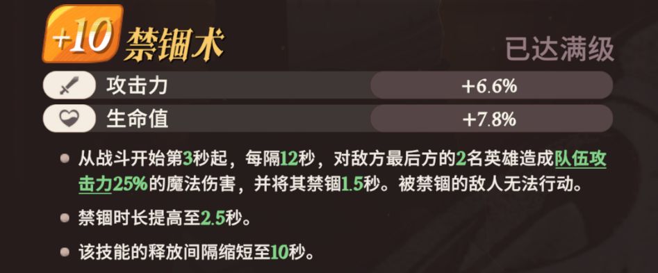 从战斗开始第3秒起,每隔10秒,对敌方最后方的2名英雄造成队伍攻击力25%的魔法伤害,并将其禁2.5秒。被禁的敌人无法行动。