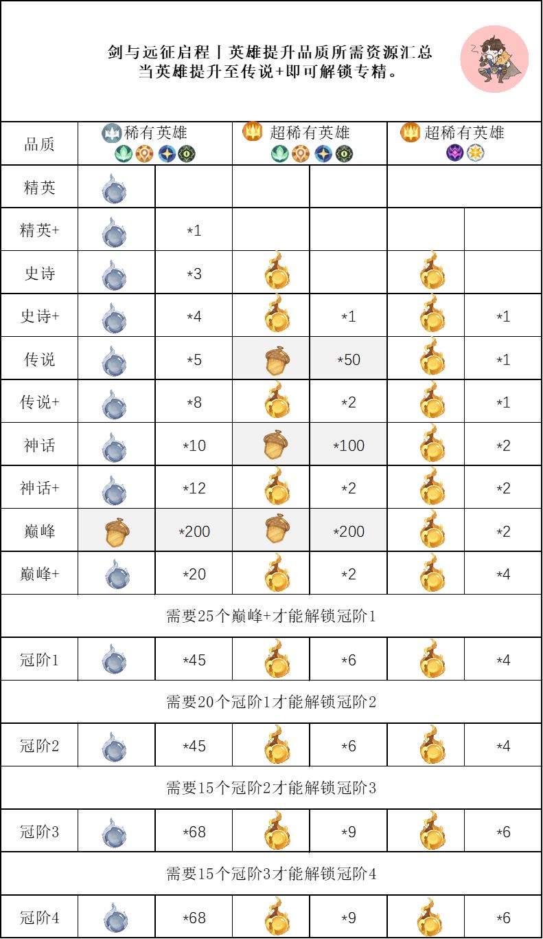 稀有英雄,超稀有英雄,神魔英雄都有不同的提升方法,具体图标如下。