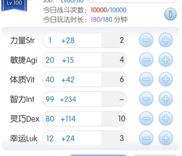 智力INT 99,灵巧DEX 40-80,敏捷AGI、体质VIT 视情况点。