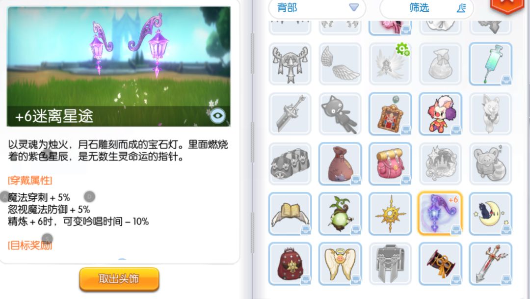 装备栏右侧:大巫师智障+12满阶+白骑士头盔/浮光之冠/其他法系头饰+单眼眼镜+魔灵火柴(小怪灼烧,多一层伤害,对MVP无效)/白胡须(魔法穿刺,加伤)/愤怒的嘴+其他尾部背部。