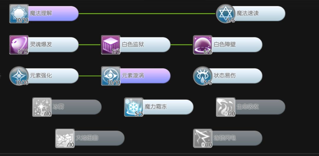 三转(60):魔法理解10 魔法速读5 元素强化10 元素漩涡10 状态易伤5 灵魂爆发3 白色监狱5 白色障壁6 魔力霜冻5 还有1点看着点,当然你也可以少点几级魔力霜冻回去补属性箭等,在此不赘述。