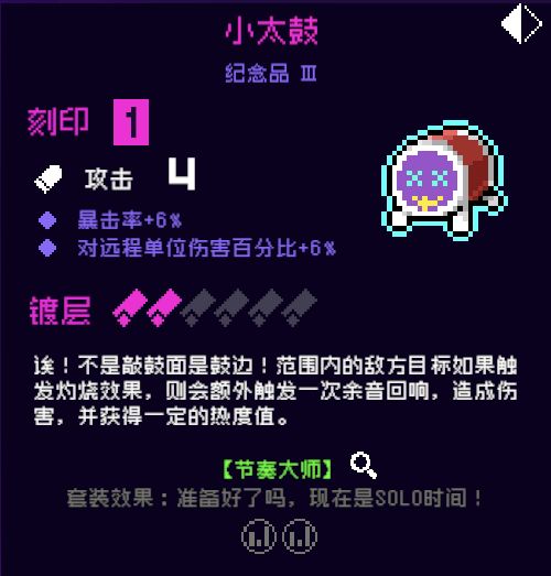9.小太鼓,3号位,目前这件好像没有出现神经矩阵每日纪念品里面吧?我没见到谁刷到过,但还是放了上去,也是提升节奏套伤害的纪念品,推荐!