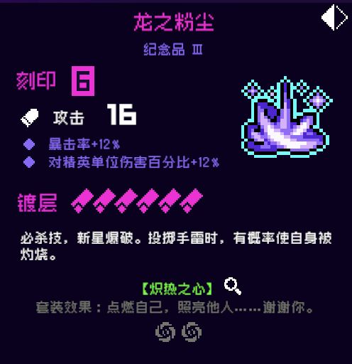 6.龙之粉尘,3号位,当年配合6模红叶称霸六期矩阵!可惜现在矩阵改版,已经见不到它的身影了,但不确定后面是否用的上,是带有概率性纪念品,拉满到100%体验很好,一般推荐。