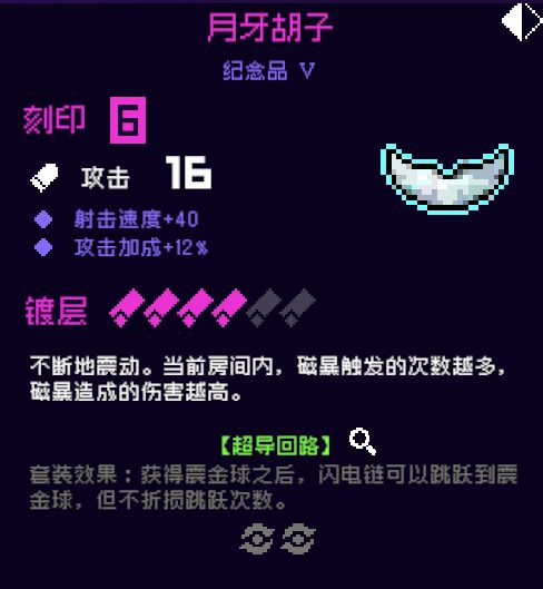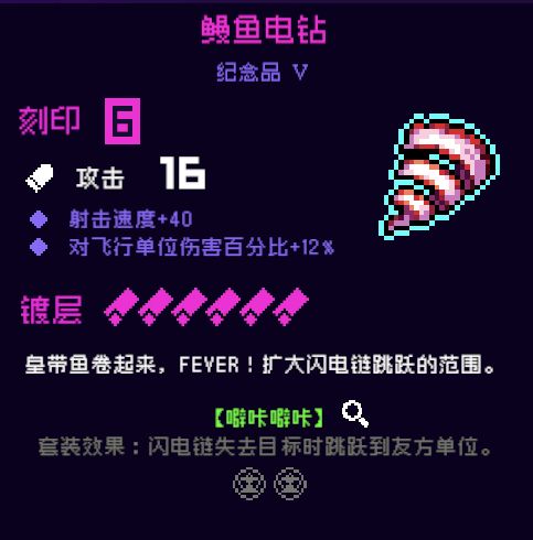 15.鳗鱼电钻,5号位,可以扩大的闪电链范围,甚至全屏幕,增加伤害范围的同时,还能更容易的吃到绝缘手套(酥酥麻麻)的加成,非常不错的一个电套纪念品!推荐!