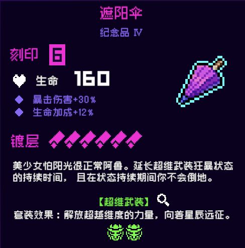 3.遮阳伞,4号位,也是超维武装(刀二)组件之一,为什么没放黑色野兽,是因为我觉得拉满输出更爽,更何况黑色野兽并不用满镀。遮阳伞乃是提升超维武装上限的重要纪念品,满镀可以使暴怒时间增加一倍,输出更持久,强烈推荐!!