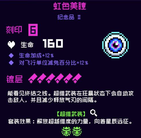 2.虹色美瞳,2号位,此件纪念品的含金量不用我多说了,简直是超维武装(刀二)的大核心,拉满后超维武装(刀二)暴怒斩击速度非常快,如果你是刚玩没多久或者刚回归的玩家,正在抽刀二套,商店刷到一定要换,强烈推荐!!