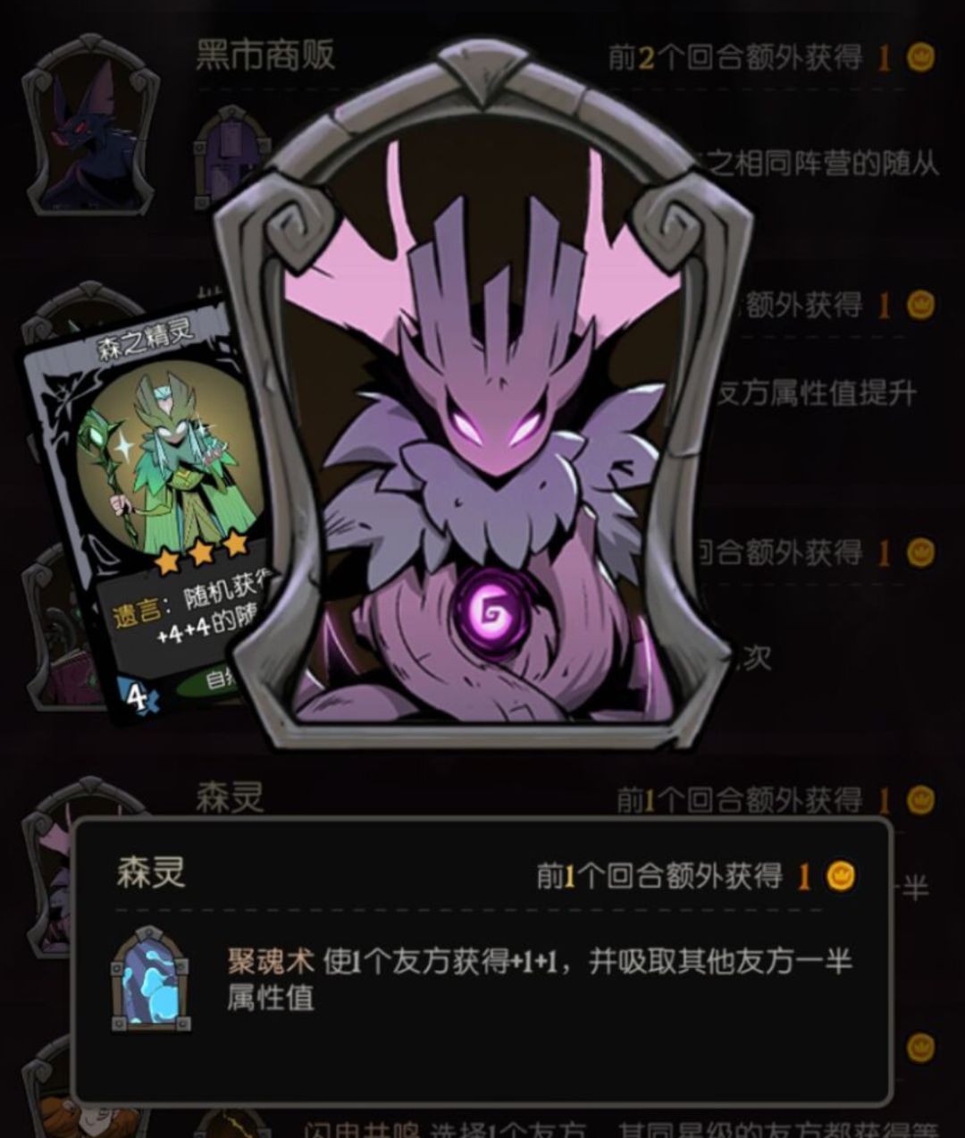 让我们先来分析一下现在的【森灵】,当前【森灵】的技能对标的是五星咒术【吸尘器】,两者都是指定一个友方吸取其他友方一半的属性,这个效果的一般用法是将属性集中到关键随从身上,将前期卖不掉的高身材低费怪,以转换身材的方式重新发挥其价值,在有【幽灵】的局时,可与【幽灵古堡】(属性变化翻倍)起到1+1大于2的效果。