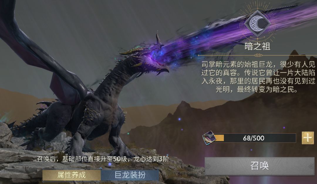二技能每五回合可对敌方全体造成一次暗元素伤害,如果目标身上有暗之祖的印记可额外再附加一层。暗之祖给敌方附加“黑暗印记”时可为目标增加易伤效果,阵灵、始祖巨龙联动可提升队伍的穿透。阵灵达到三级后解锁三技能,可基于队伍的元素评分提供大量的部队加成;四级后可提升暗之祖咆哮的基础伤害,让巨龙拥有更强的输出火力。