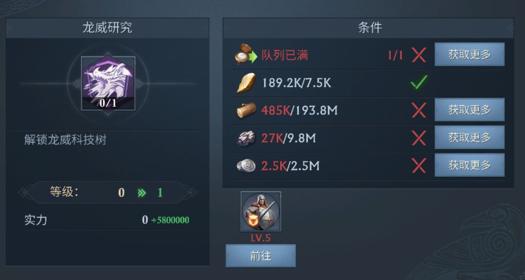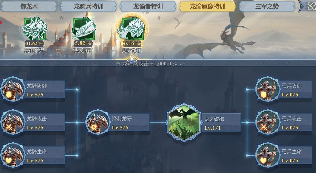 在解锁龙谕魔像后,可研究一系列兵种科技,进一步提升部队的战力数值。除了御龙术以外,这次还加入了龙谕魔像特训科技树,这个科技树主要是提升龙骑兵的三维、T15龙骑的特殊技能数值。整个科技树“研究缺口”很大,如果想短时间内取得优势,就直接用加速(别人没有,你有,这样才是优势。后面如果大家科技都追上来,就没有优势)。