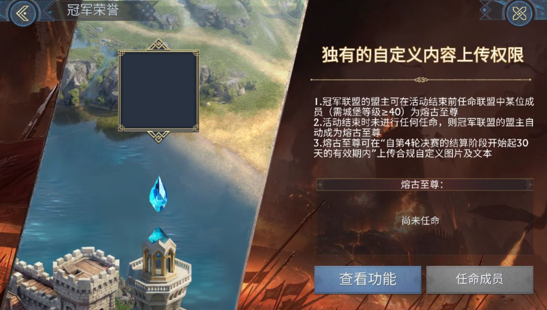 在经过夺冠轮次后,冠军联盟的盟主可任命联盟某位成员为熔古至尊。熔古至尊可在界面中上传自定义头像、文本,在所有领主的要塞界面中展示,是目前《阿瓦隆之王》最顶级的荣耀称号。