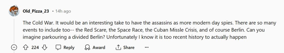 一名玩家认为下一部游戏应该是以冷战为背景,毕竟当时苏美之间的间谍活动相当之多,非常符合刺客信条中潜行刺杀的调性。