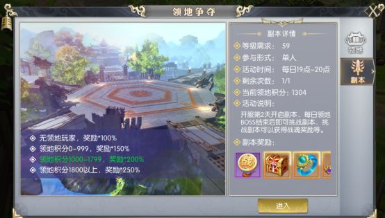 挑战副本可获得战力、战魂、极品戒指和极品项链,没有领地的玩家,挑战副本可获得100%奖励;领地积分在0-999之间,挑战副本可获得150%奖励;;领地积分在1000-1799之间,挑战副本可获得200%奖励;领地积分在1800以上,挑战副本可获得250%奖励。