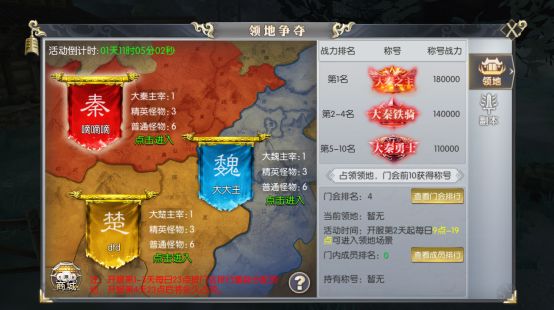 占领要求:根据门会战力排行,战力前3的玩家,依次占领秦、楚、魏3个领地。