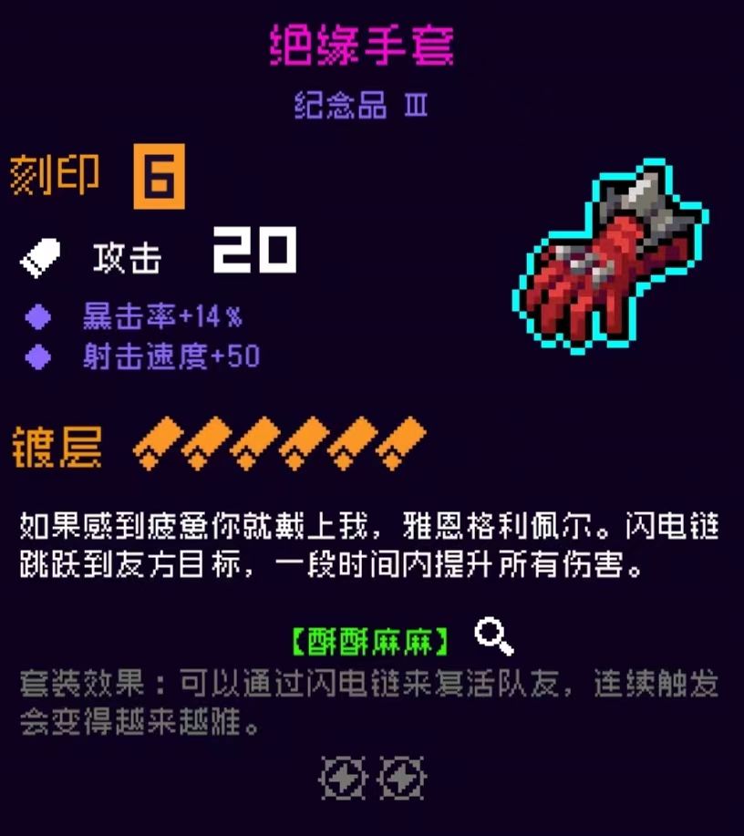 八、涉及电属性伤害的套(节奏大师、霓虹风暴、爆裂螺旋、酥酥麻麻、噼咔噼咔、超导回路等)-绝缘手套(3号位)、芯红辣椒(5号位)