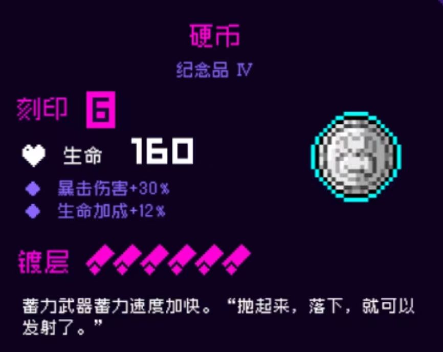 实测陆携带硬币后,角色武器蓄力攻击触发速度变快,武器射速变快。
