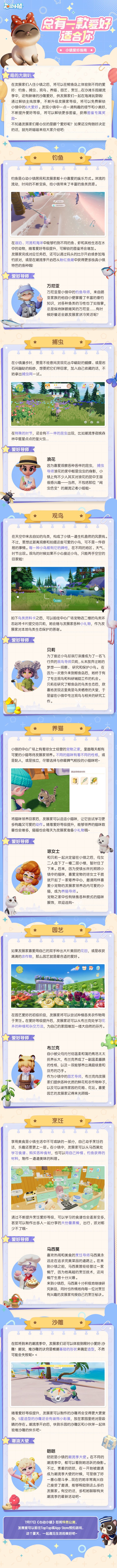 今天喵喵为大家带来的是小镇中的爱好玩法指南。发展家们入住小镇之后,可以从不同的爱好导师处学习和提升各种不同的爱好:钓鱼、捕虫、观鸟、养猫、园艺、烹饪……在潮流季中,还有新增的沙雕爱好,供发展家一起在夏日的沙滩边玩耍哦~