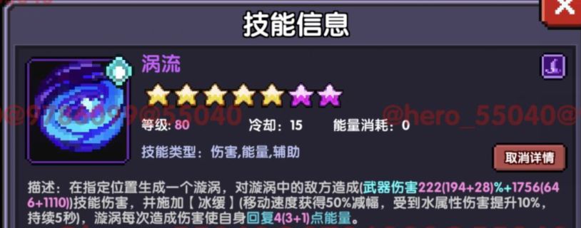 5星效果,骇浪:换来大雨,使友方水属性伤害加成增加50%,开启涡流后生成漩涡并引发水龙卷,移动速度+1,每0.5s造成(涡流+凝渊)总体*360%的技能伤害