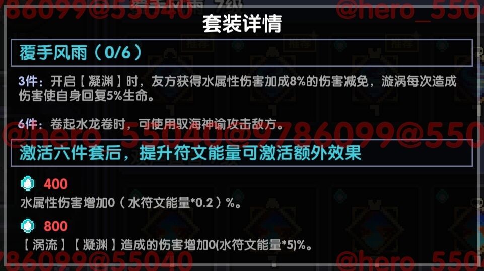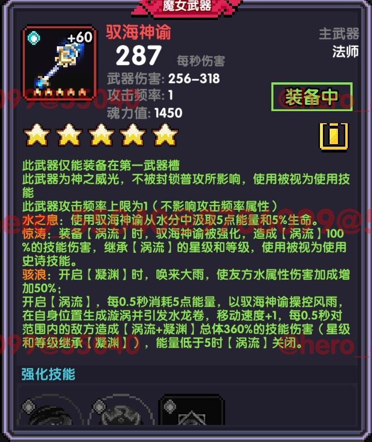 装备涡流时,驭海神谕被强化,造成涡流100%技能伤害,因为新水魔女不需要CD,带龙虎元素四开关,省手