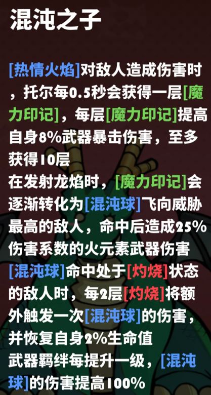 另外,混沌球获得羁绊后伤害提升100%,;混沌球命中有灼烧的敌人时,每2层灼烧都能让混混沌再造成一次伤害,并恢复血量