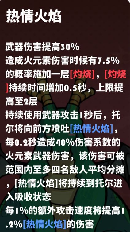 30%武器增伤区;双倍灼烧伤害;每秒200%的热情之火武器倍率,以及夸张的热情之火增伤大后期增伤幅度高达恐怖的6倍之多!必须携带攻速武器!