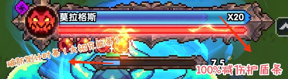②狂暴状态:BOSS怒气值满条进入狂暴状态,血条会覆盖一层100%减伤护盾(也就是所说的破防条,只能吃到觉醒技),BOSS数值条下方会出现一个破防倒计时条,时间一到会自动破防,BOSS就会开大招并进入破防状态