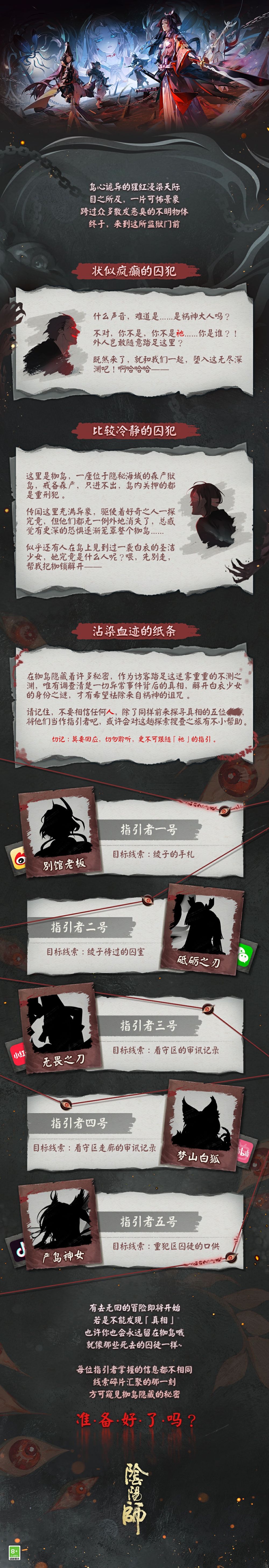 从踏上枷岛的那一刻起,就注定没有回头之路,要想活下去,唯有继续前行。大人们可根据指引者的线索前往各处调查,揭开枷岛谜团背后的真相!彷徨时多加留心,诡谲之言不可轻易相信。