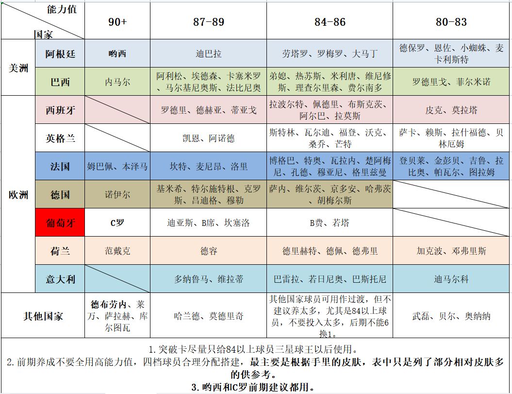 一、新手玩家比较在意的开局选择:我认为本游戏养成思路应当是逆推式的,先选定你想发展的国家,再对前期养成作一些规划,下面做了一些简单的普通球员统计做参考。