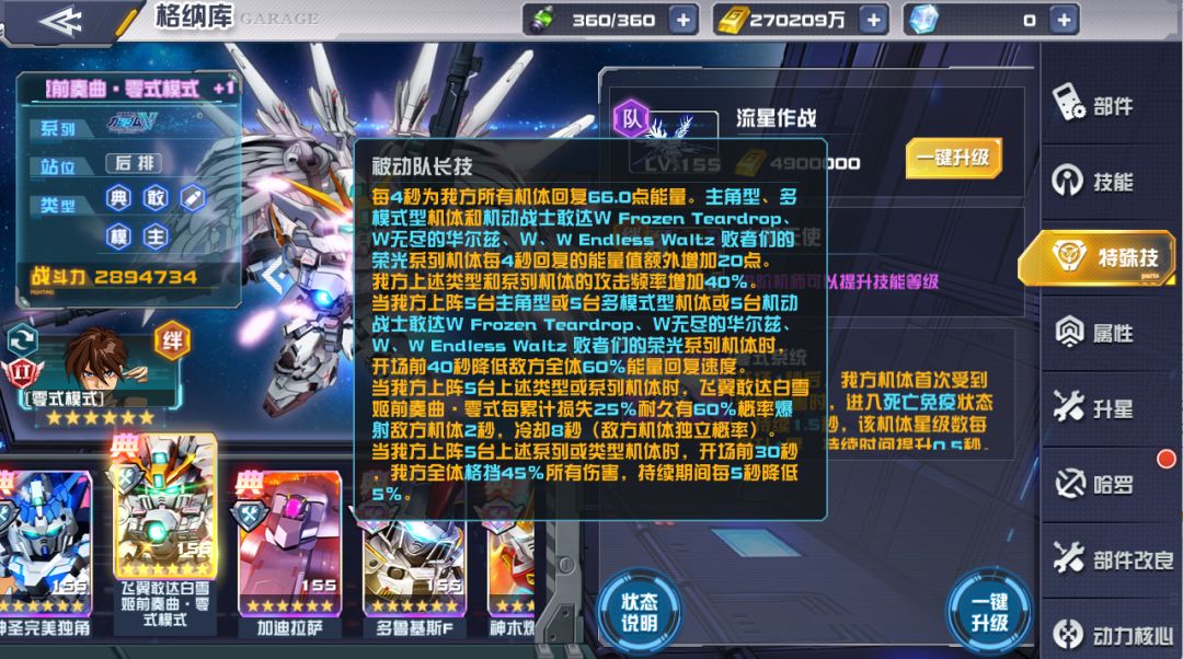 机体6星时,伤害提升80%,爆射时间增加2秒,精神力感应/能量涌动/危险对象增加1台,触发无法回复耐久/无法回复能量的冷却降为8秒。当我方上阵5台主角型或5台多模式型或5台机动战士敢达W Frozen Teardrop、W无尽的华尔兹、W、W Endless Waltz 败者们的荣光系列机体时,开场前15秒,自身、精神力感应和能量涌动机体受到降低能量效果时,降低的值减少30%,并获得动力汲取(将造成伤害的30%完全转换为耐久)。