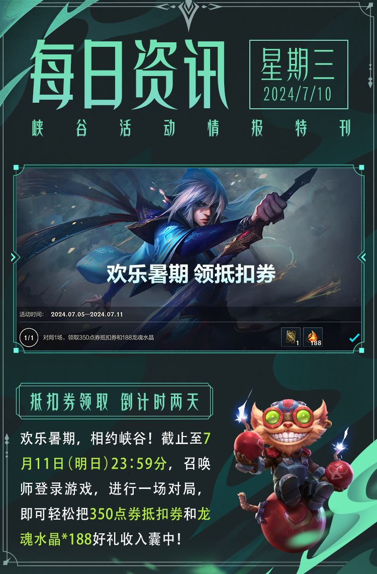 同时,召唤师们也别忘了,在7月21日登录游戏,即可领取史诗级皮肤以及各种好礼哦!