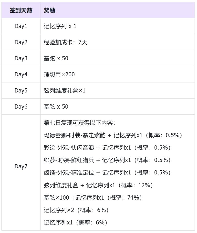 6元开启长廊复现,每日登录必定获得记忆序列、基弦等奖励,累计登录7日还有机会获得完美品质时装。
